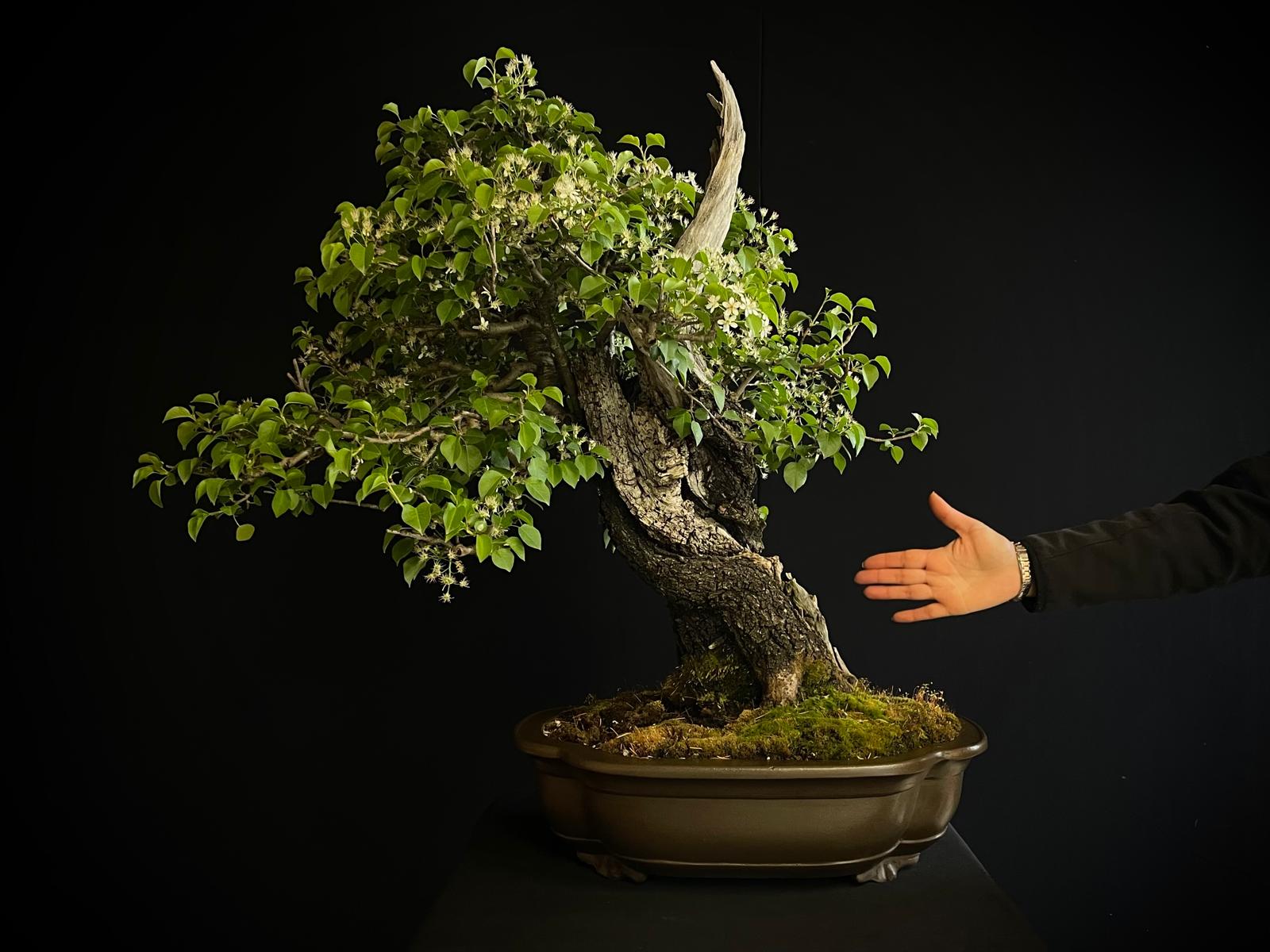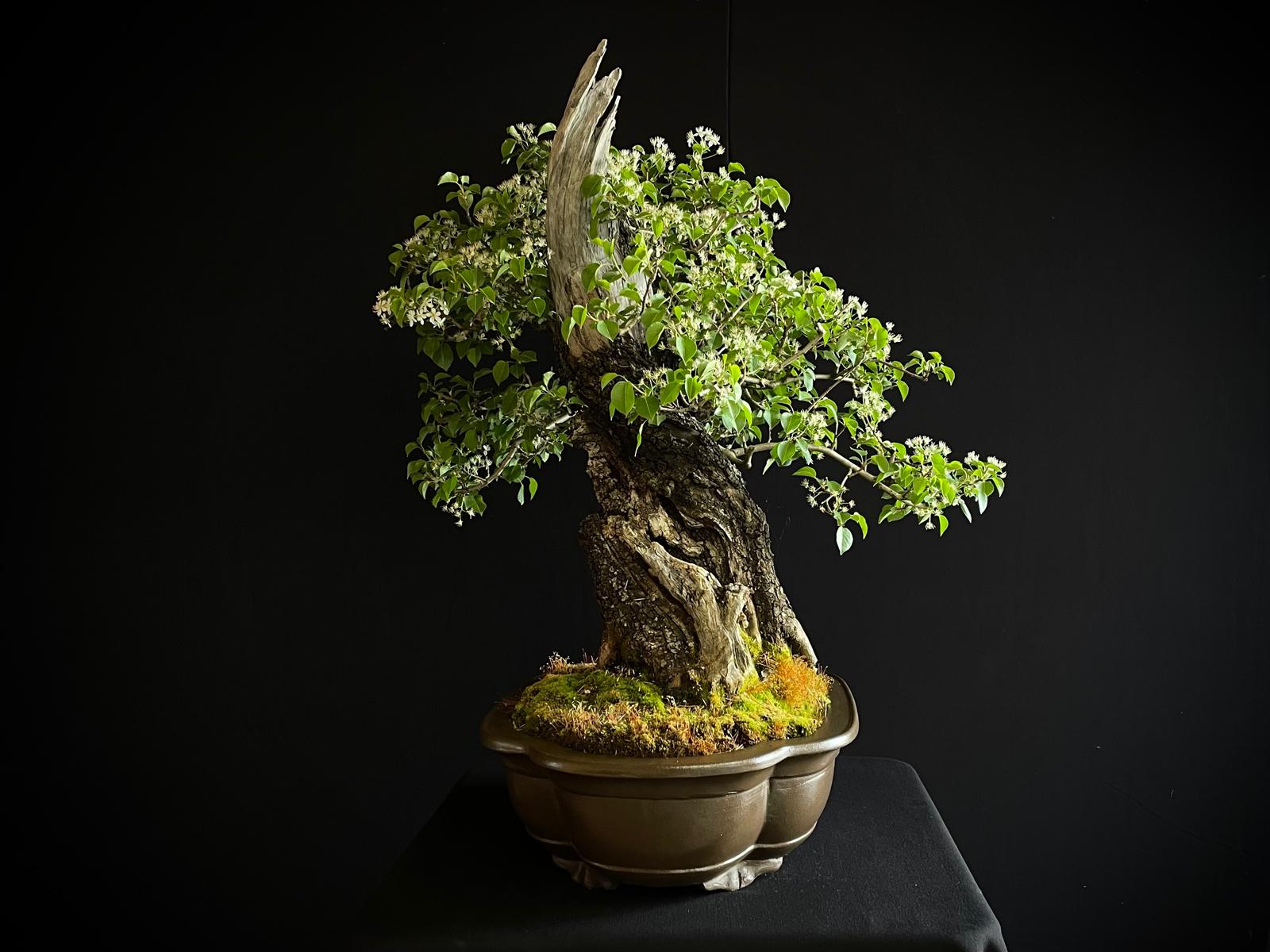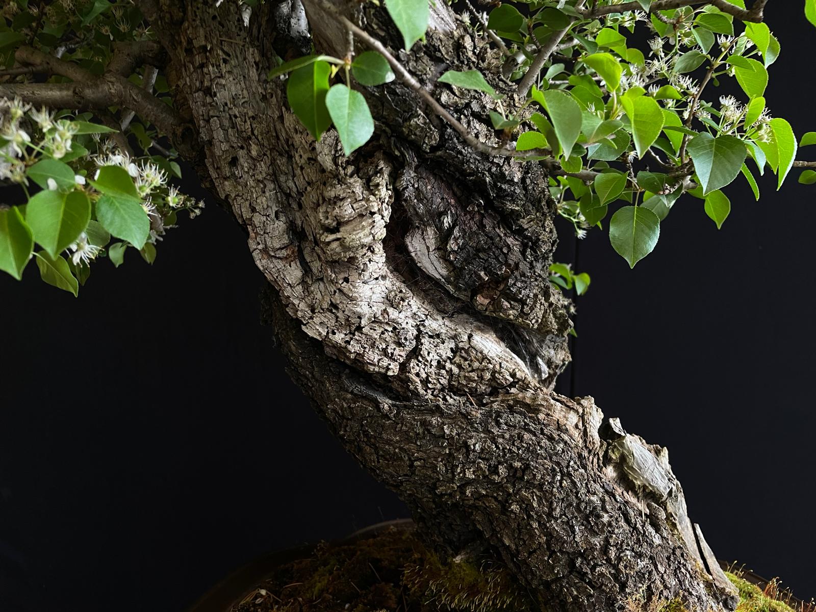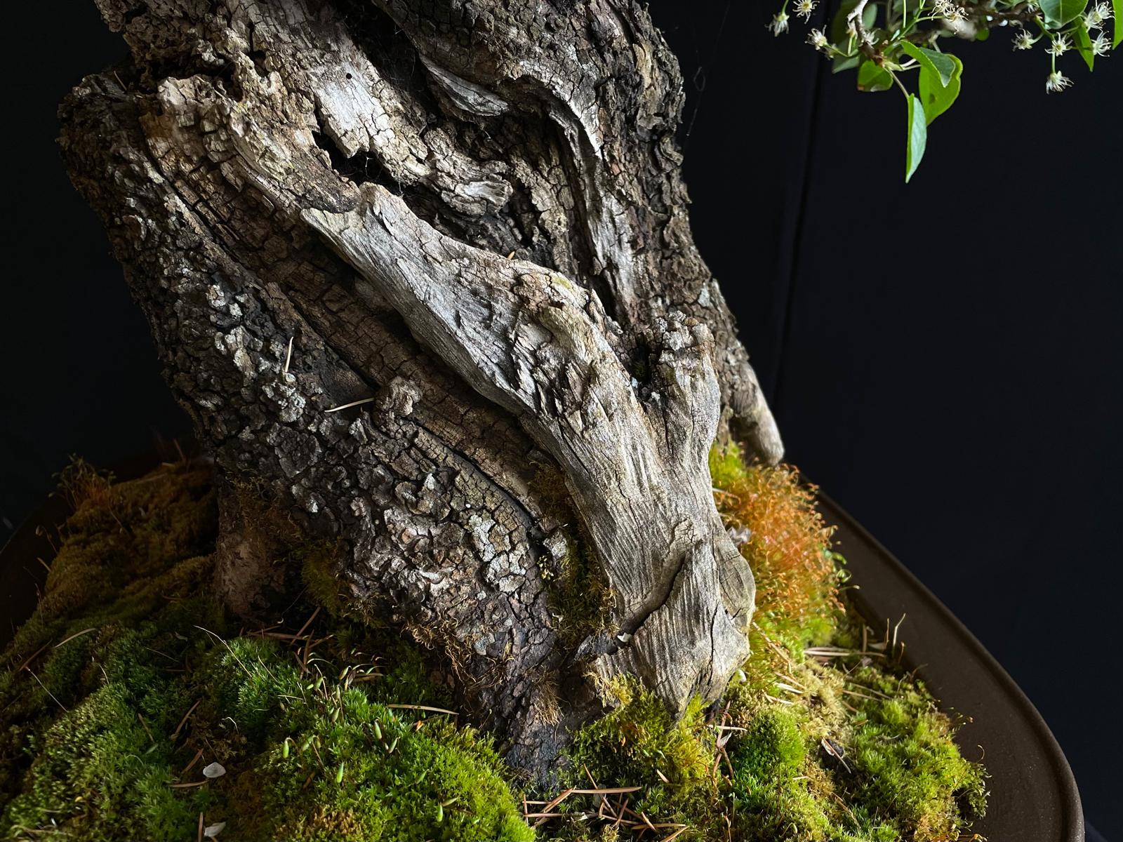 Es un ejemplar impactante desde el primer momento. Muestra un tronco muy grueso y robusto que transmite esa sensación de solidez y fortaleza, lo que se suma a su apariencia majestuosa y poderosa. Su madera muerta es otra característica muy destacada, con una textura craquelada y una forma única que le confiere un gran valor estético a este bonsái.