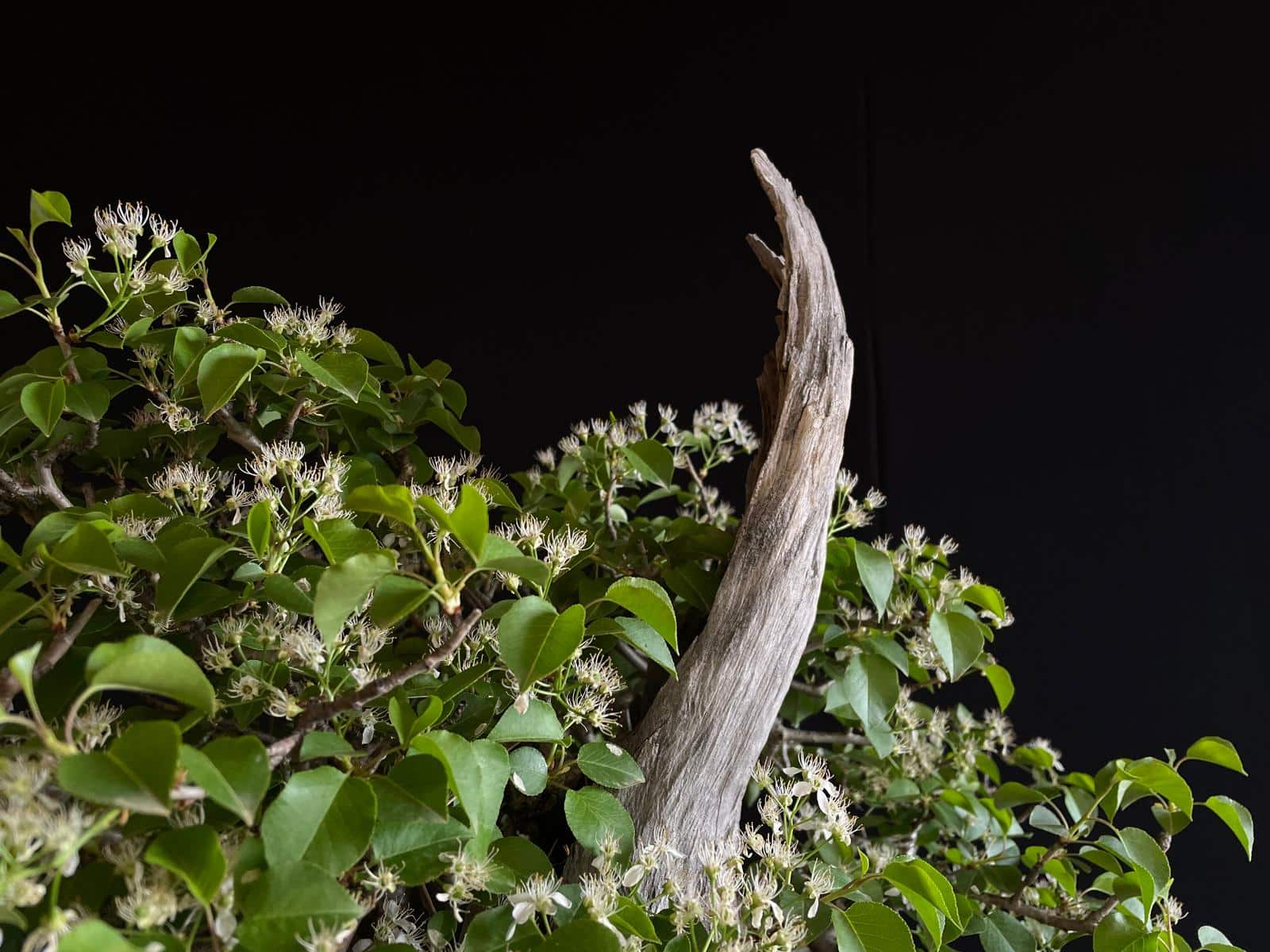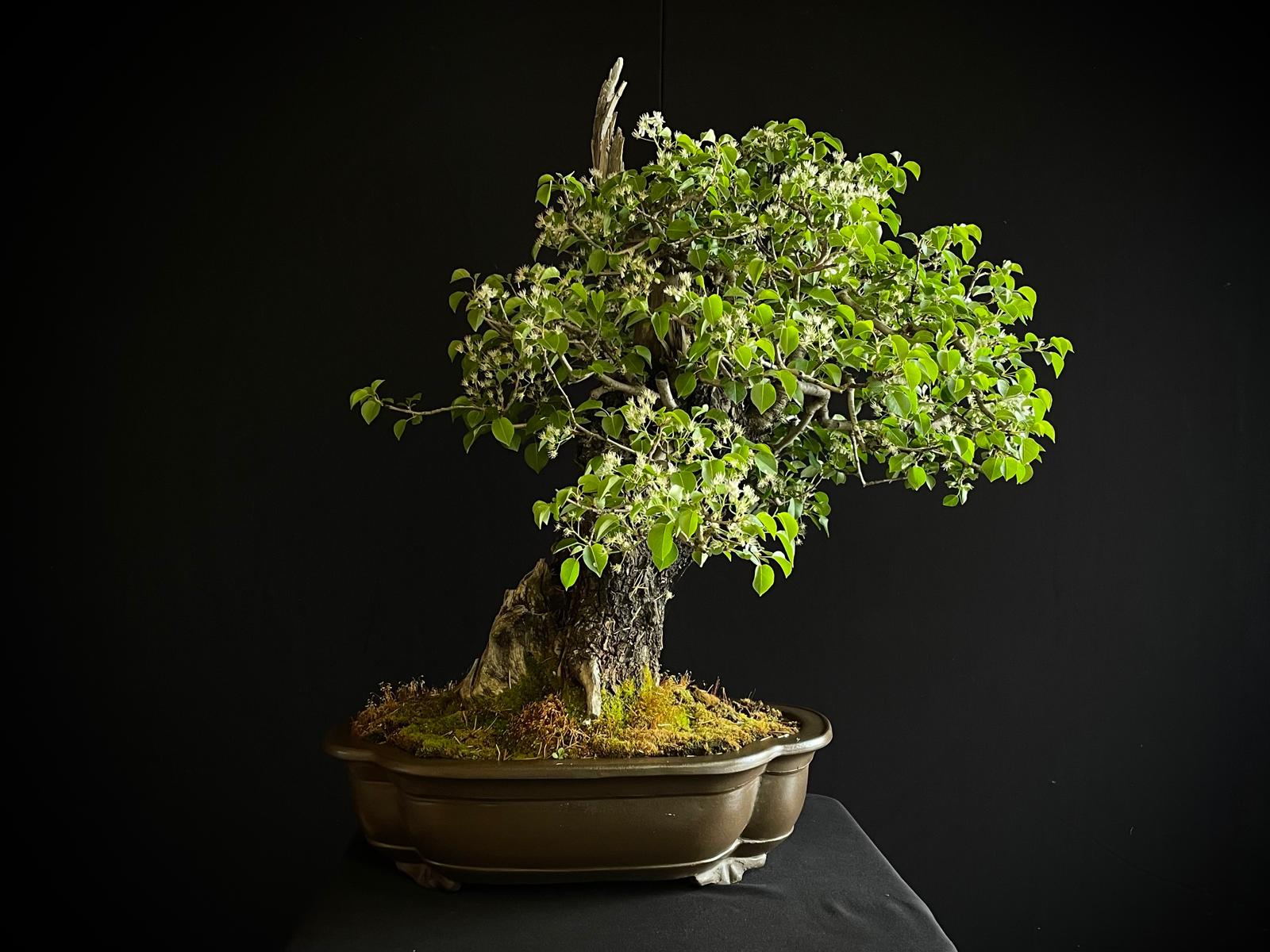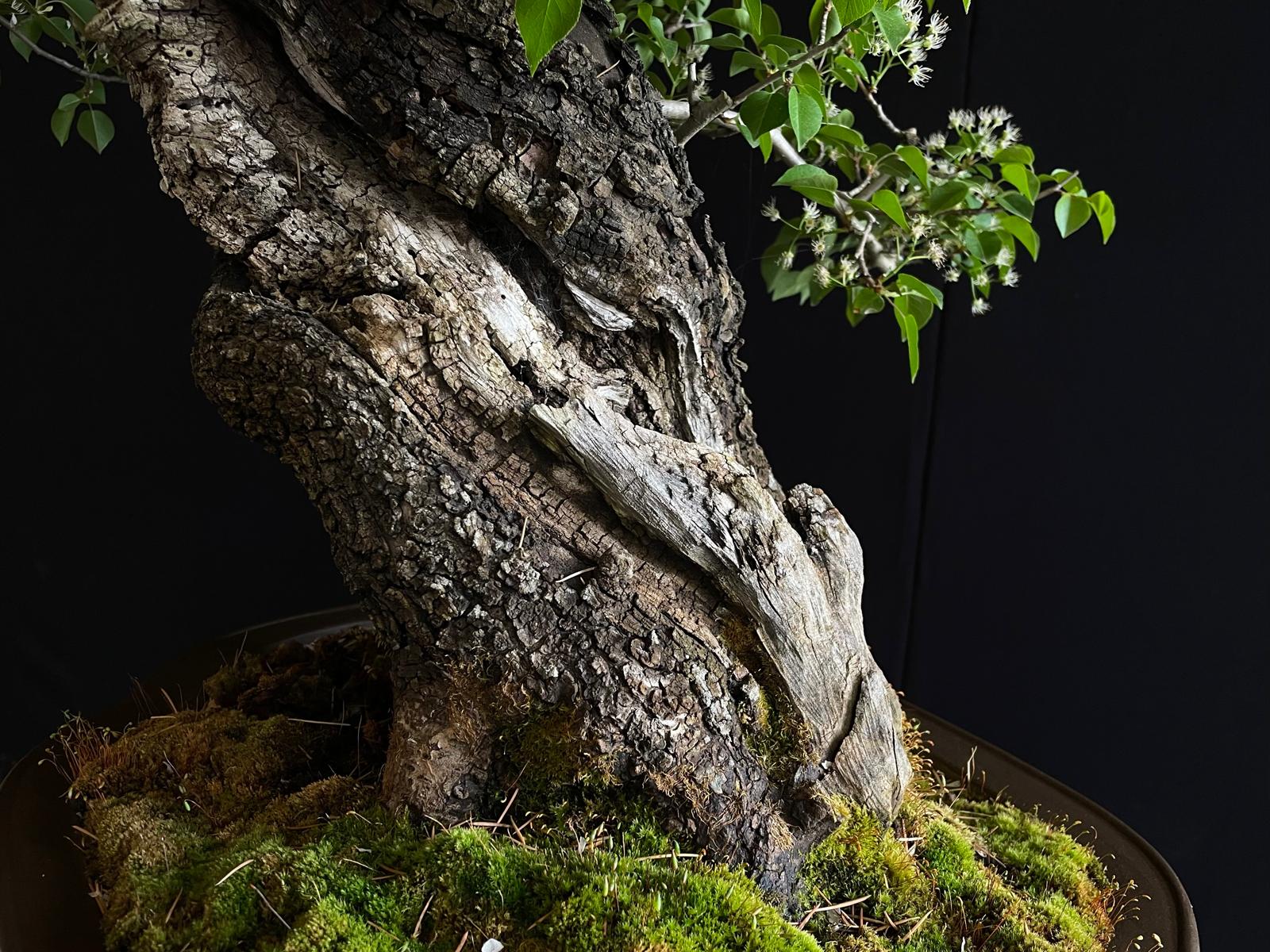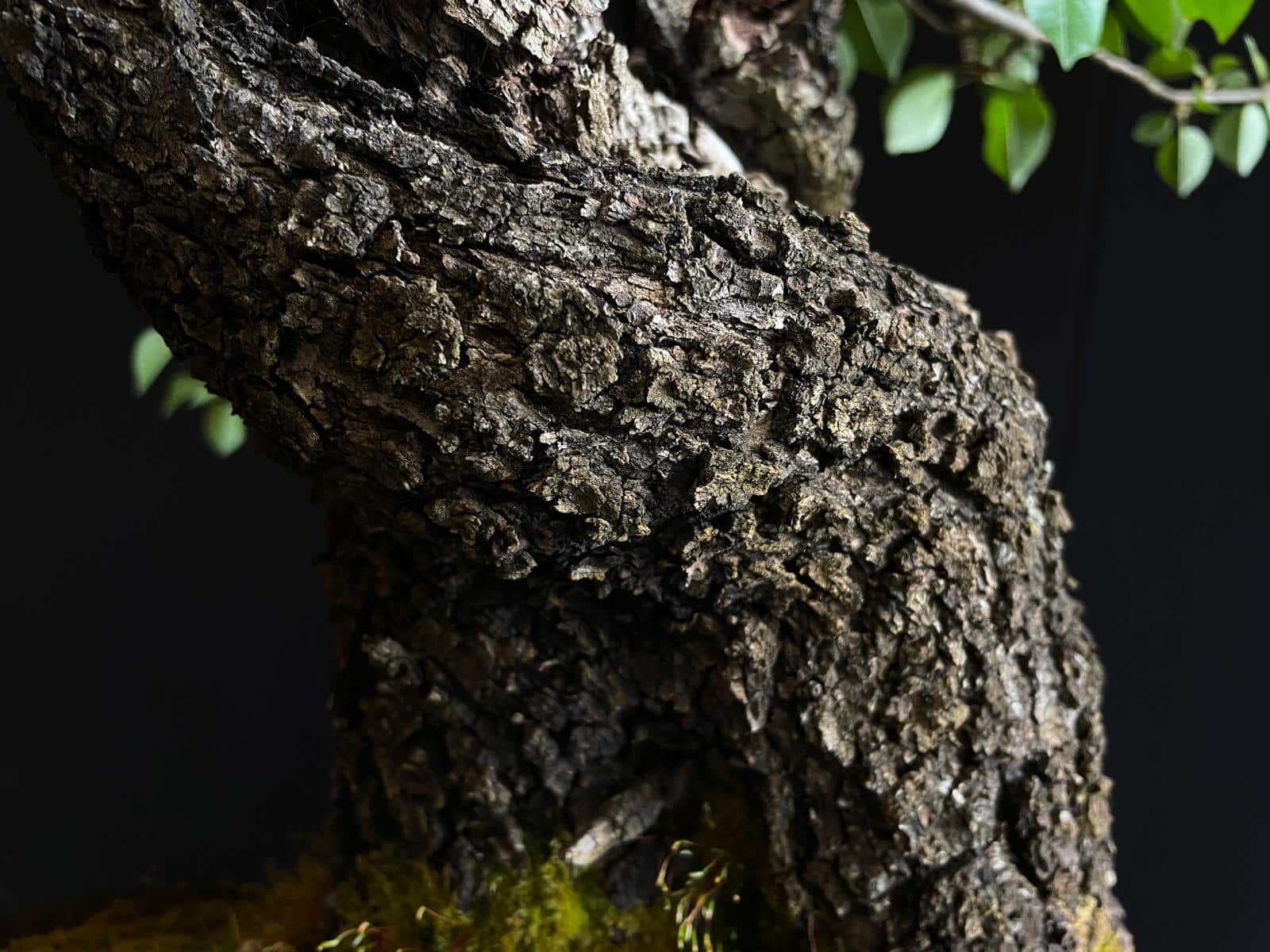 Es un ejemplar impactante desde el primer momento. Muestra un tronco muy grueso y robusto que transmite esa sensación de solidez y fortaleza, lo que se suma a su apariencia majestuosa y poderosa. Su madera muerta es otra característica muy destacada, con una textura craquelada y una forma única que le confiere un gran valor estético a este bonsái.