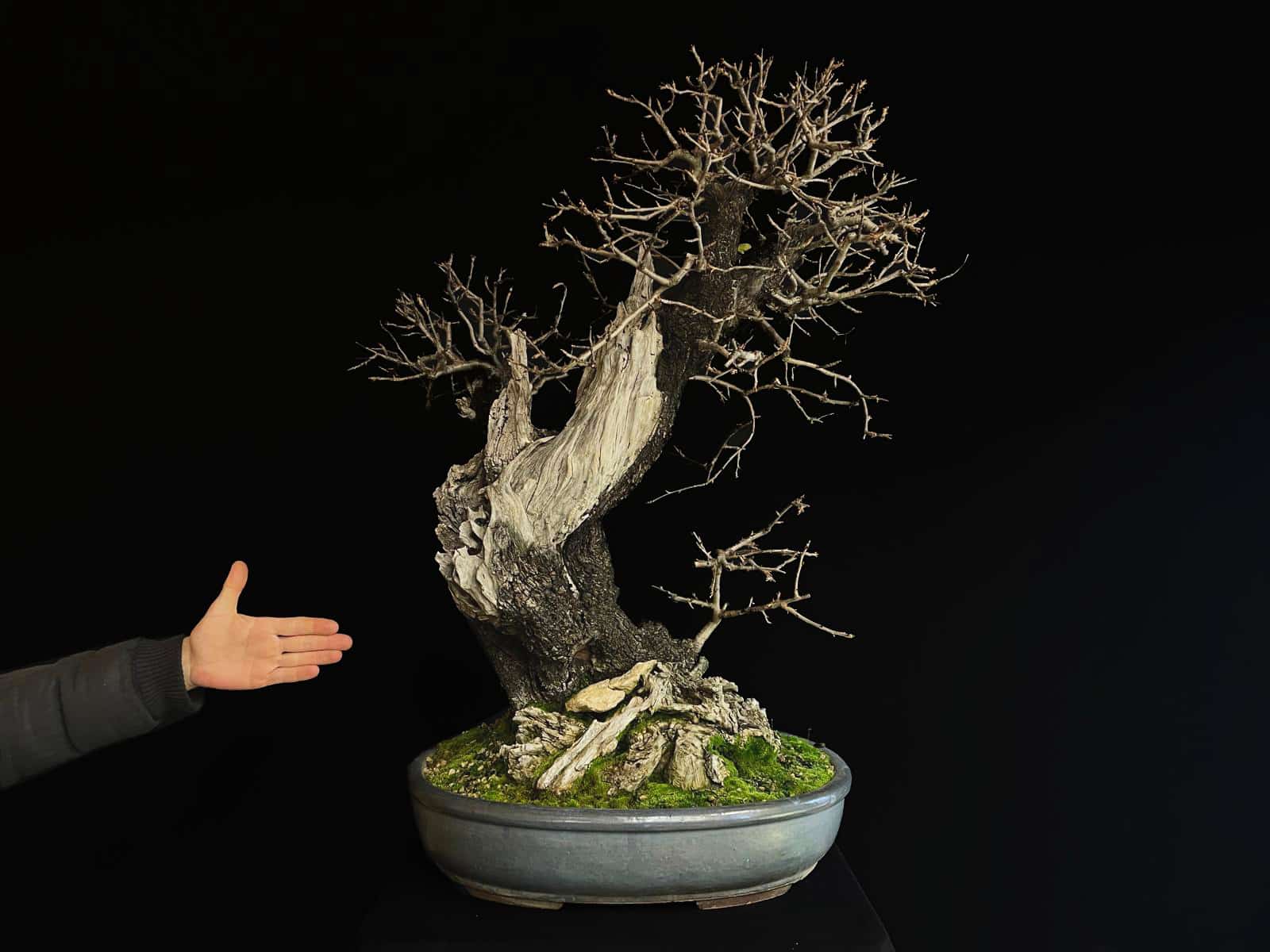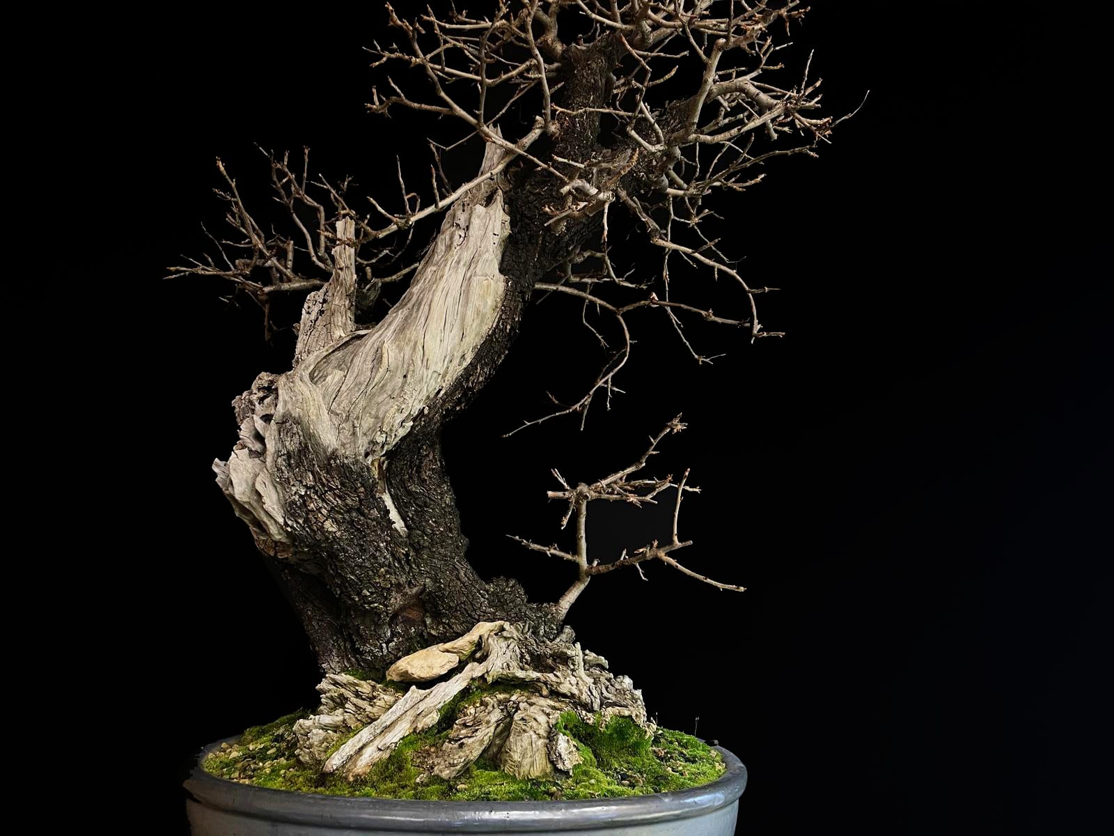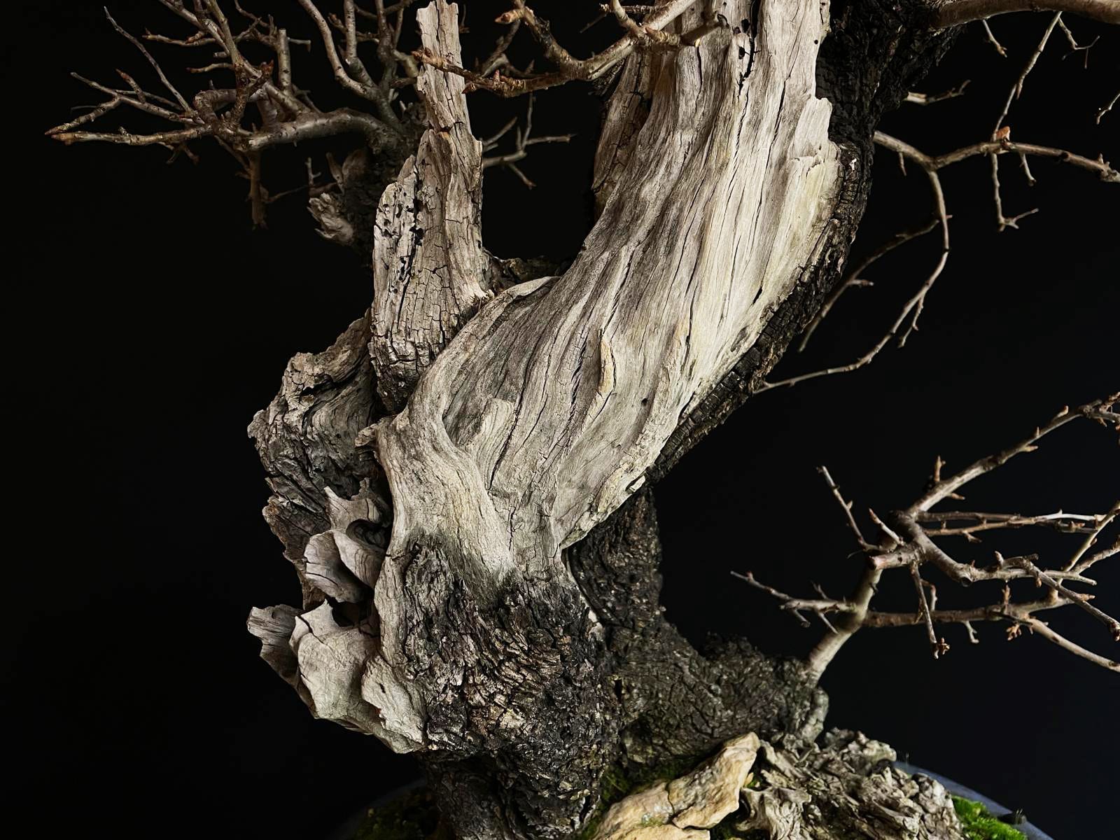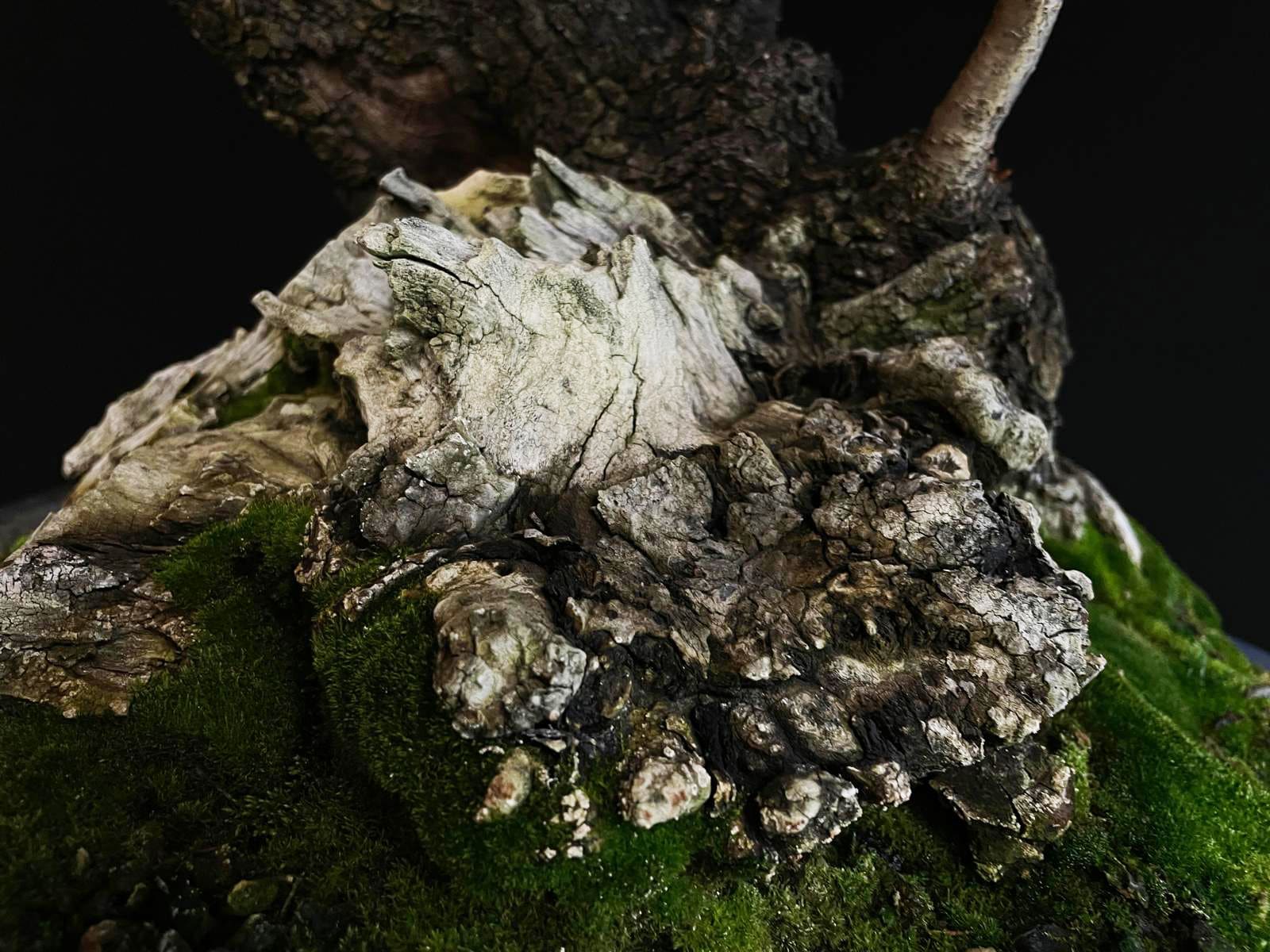Este cerezo de Santa Lucía o Prunus mahaleb, es un ejemplar impactante desde el primer momento. Muestra un tronco muy grueso y robusto que transmite esa sensación de solidez y fortaleza, lo que se suma a su apariencia majestuosa y poderosa. Su madera muerta, es otra característica muy destacada, con una textura craquelada y una forma única que le confiere un gran valor estético a este bonsái.