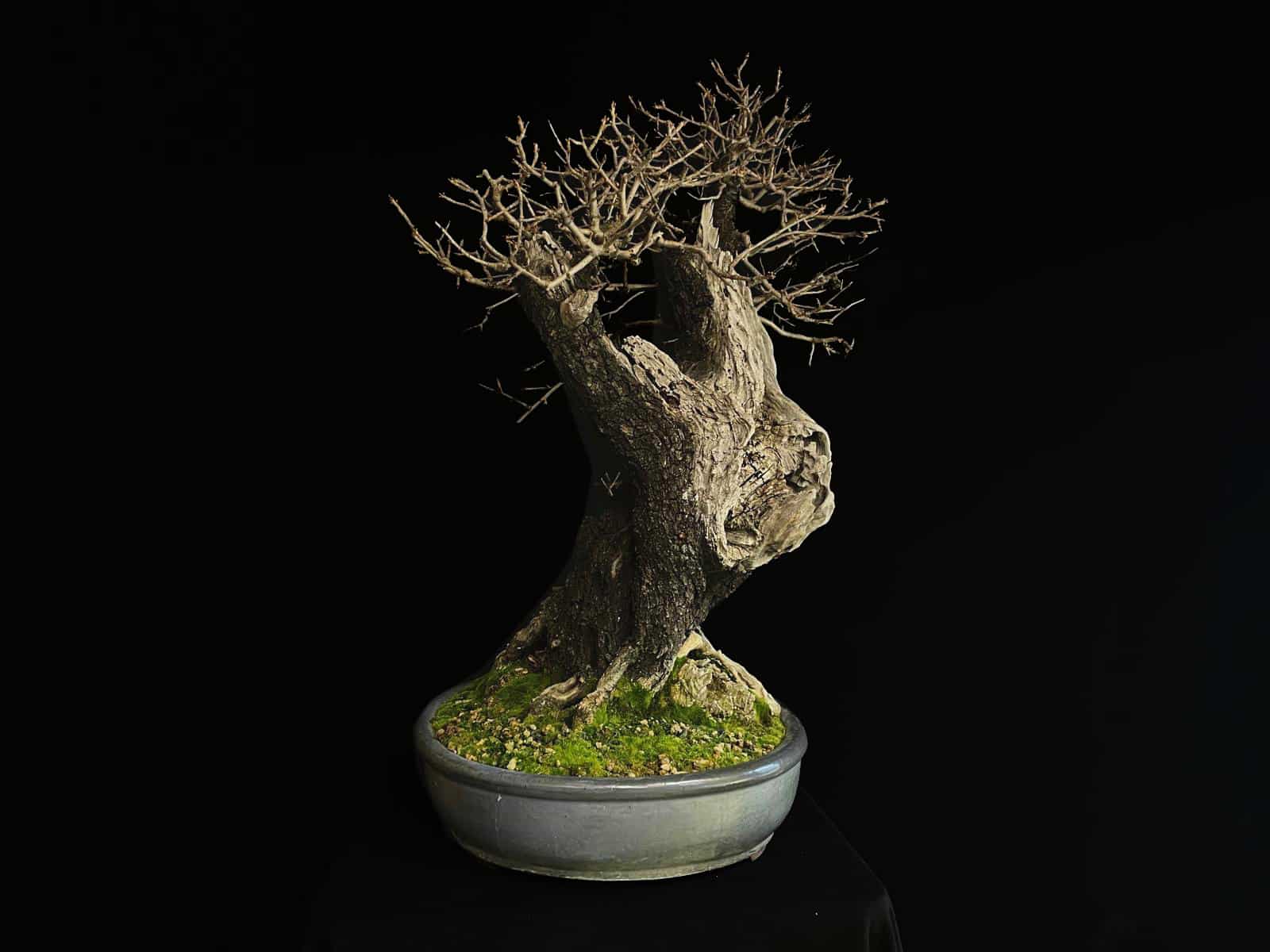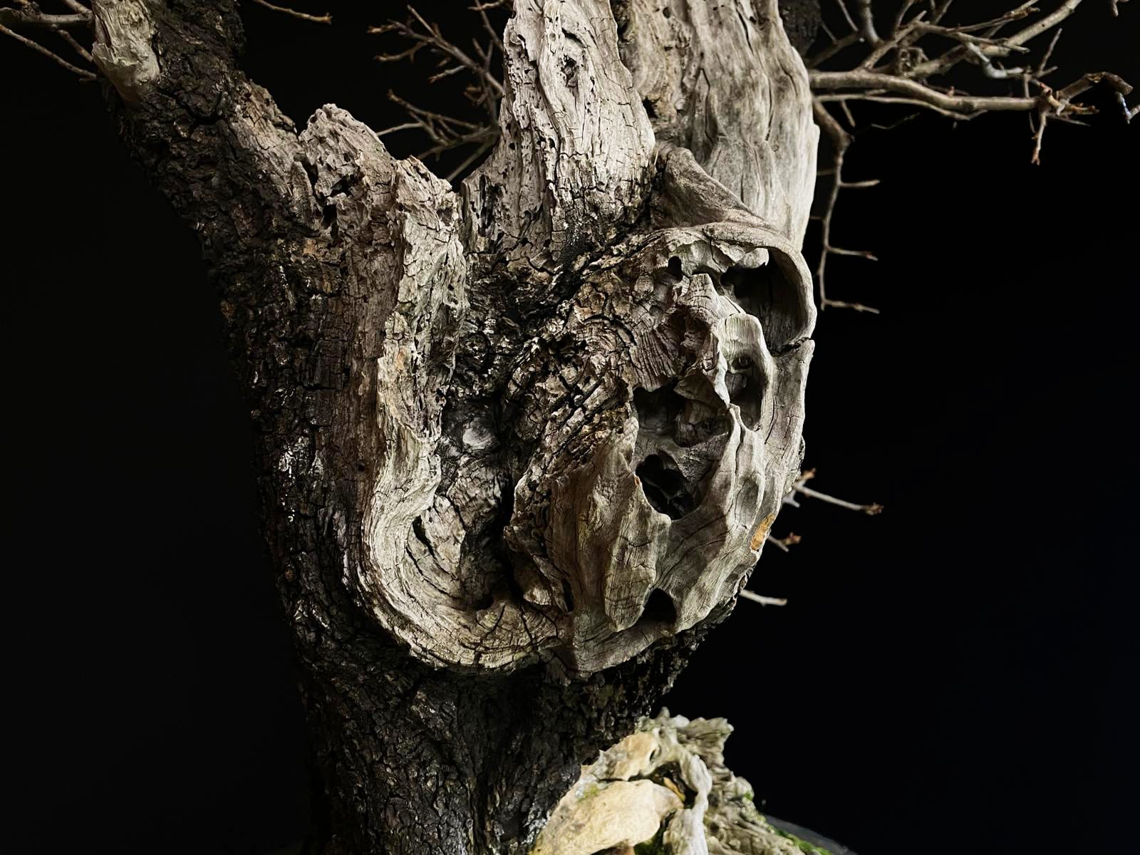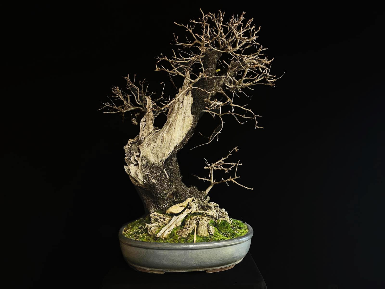 Este cerezo de Santa Lucía o Prunus mahaleb, es un ejemplar impactante desde el primer momento. Muestra un tronco muy grueso y robusto que transmite esa sensación de solidez y fortaleza, lo que se suma a su apariencia majestuosa y poderosa. Su madera muerta, es otra característica muy destacada, con una textura craquelada y una forma única que le confiere un gran valor estético a este bonsái.