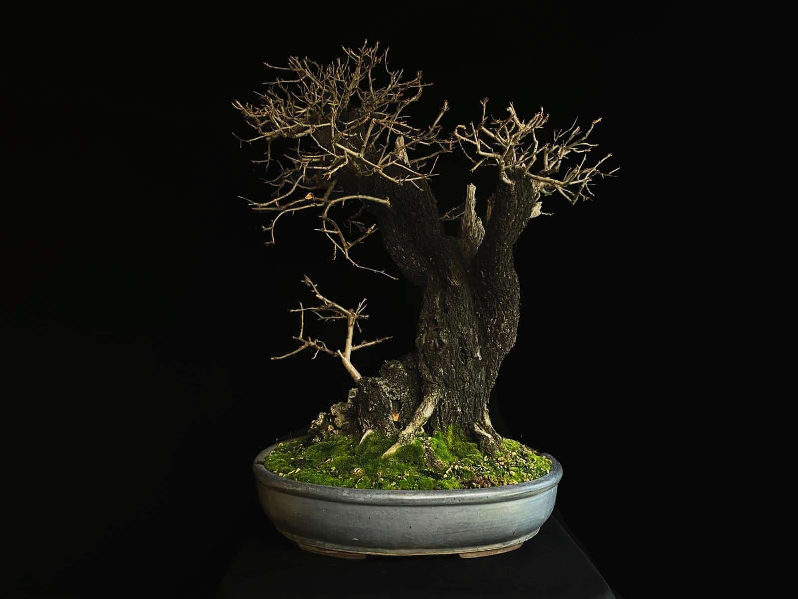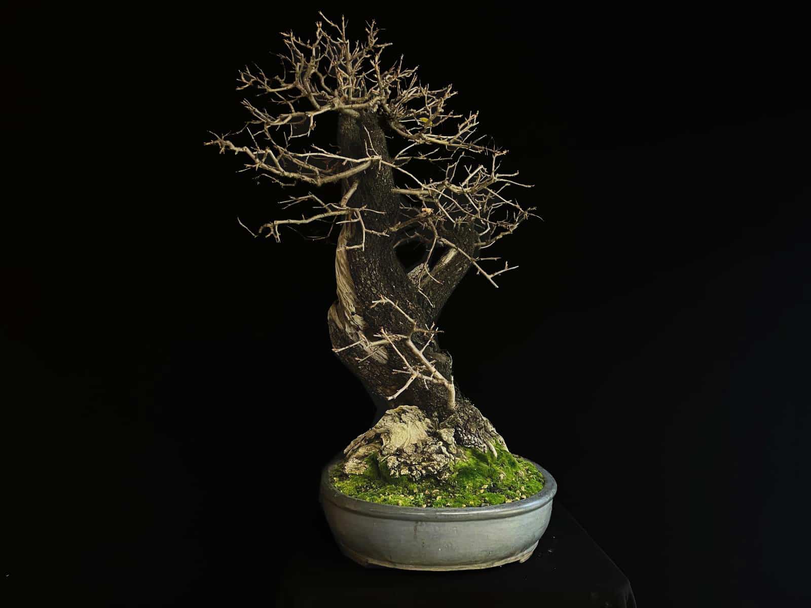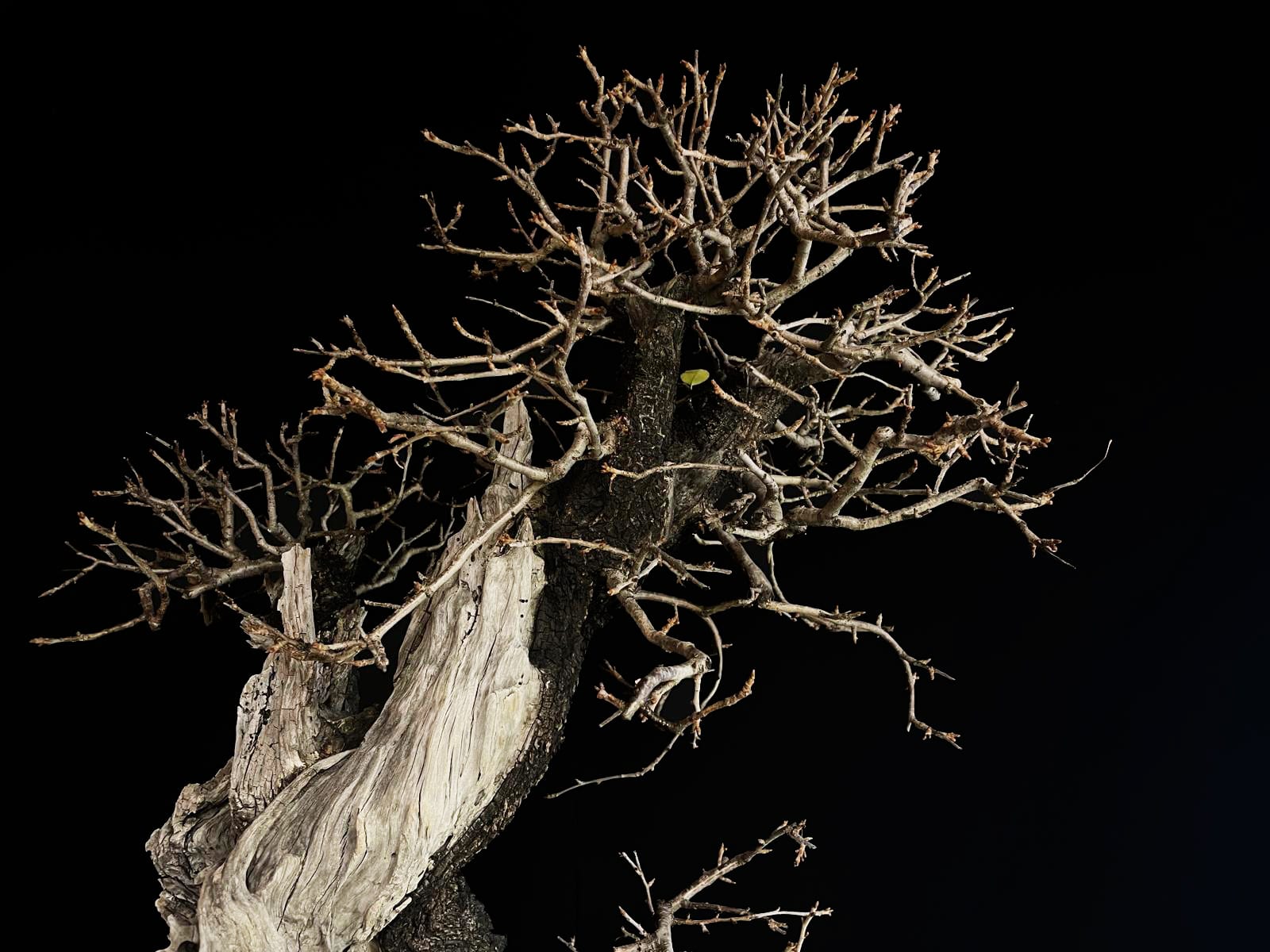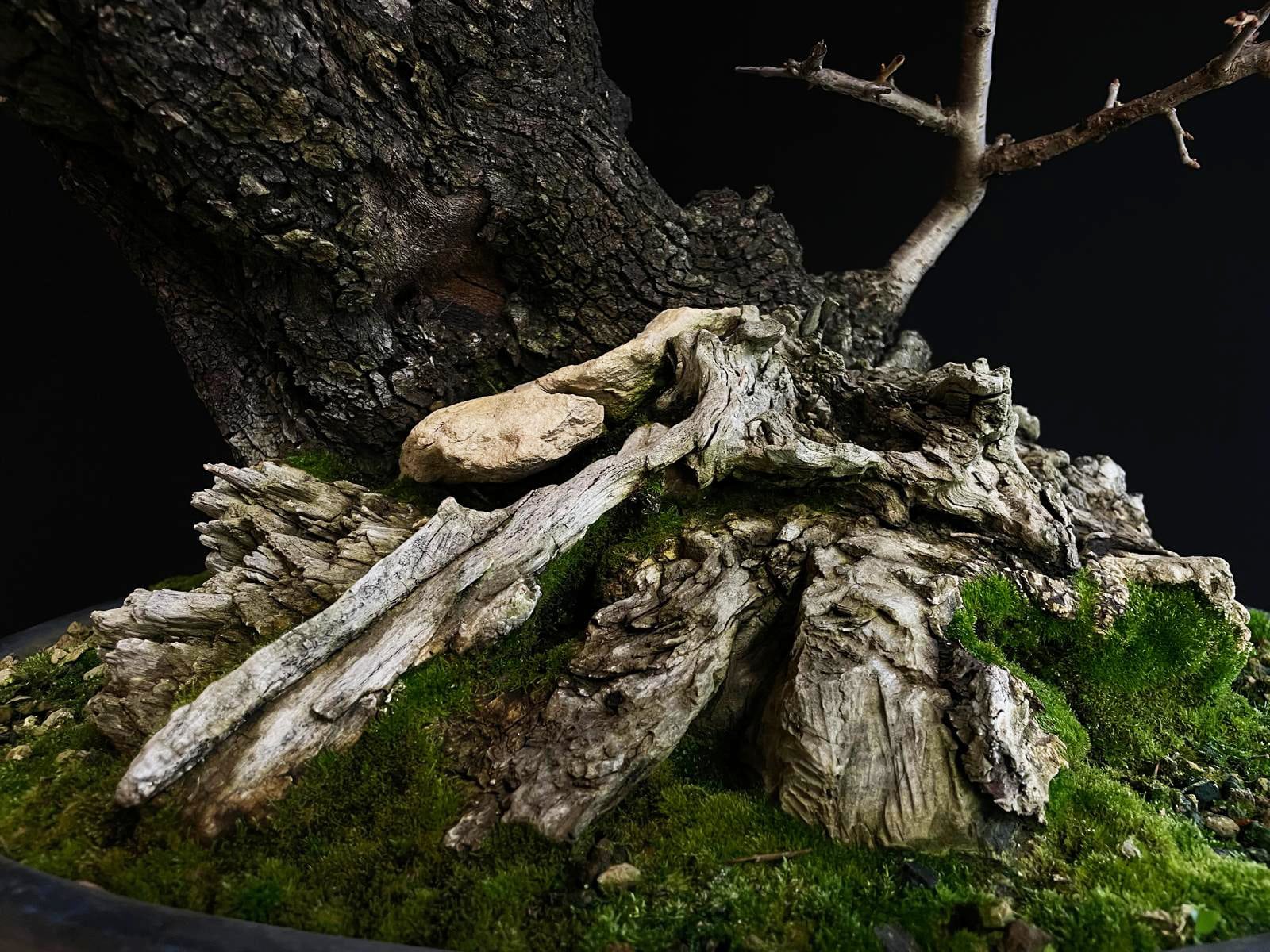Este cerezo de Santa Lucía o Prunus mahaleb, es un ejemplar impactante desde el primer momento. Muestra un tronco muy grueso y robusto que transmite esa sensación de solidez y fortaleza, lo que se suma a su apariencia majestuosa y poderosa. Su madera muerta, es otra característica muy destacada, con una textura craquelada y una forma única que le confiere un gran valor estético a este bonsái.