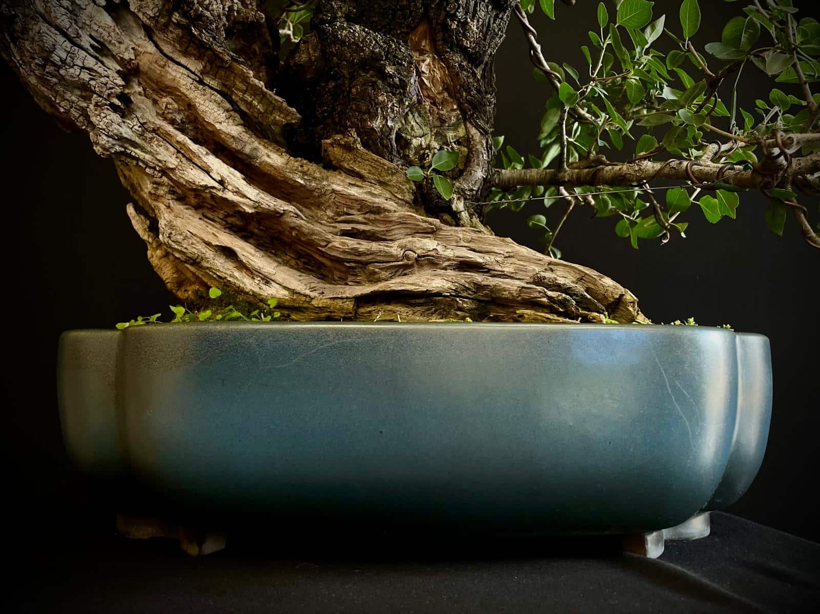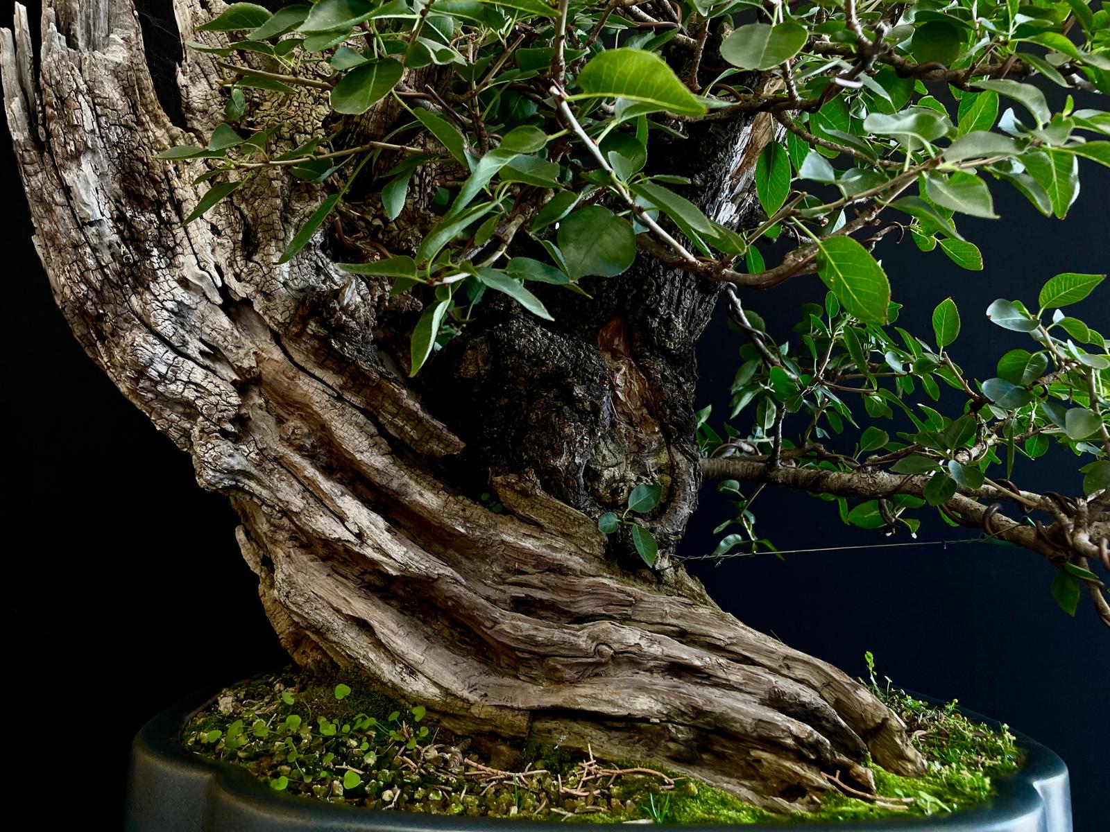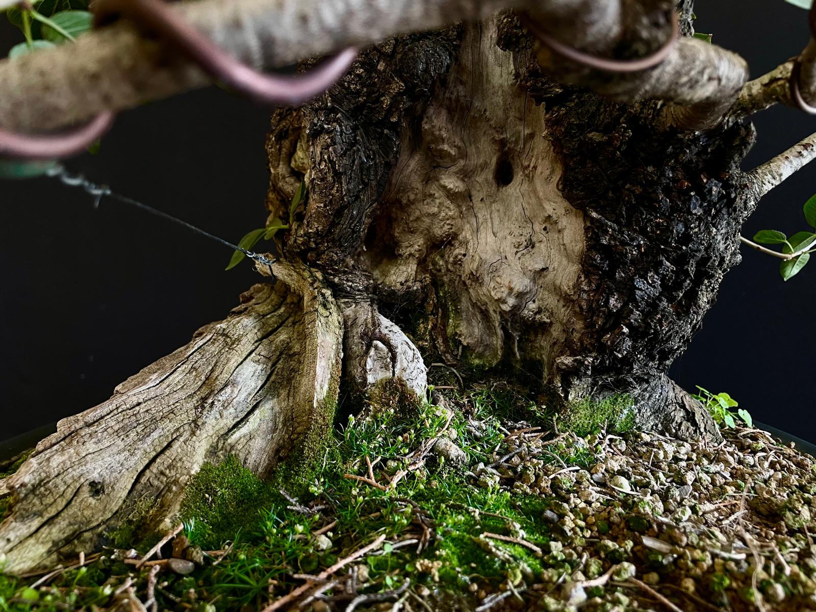 Prunus mahaleb (Cerezo de Santa Lucía) es un ejemplar impactante desde el primer momento. Muestra un tronco muy grueso y robusto que transmite esa sensación de solidez y fortaleza, lo que se suma a su apariencia majestuosa y poderosa. Su madera muerta es otra característica muy destacada, con una textura craquelada y una forma única que le confiere un gran valor estético a este bonsái.