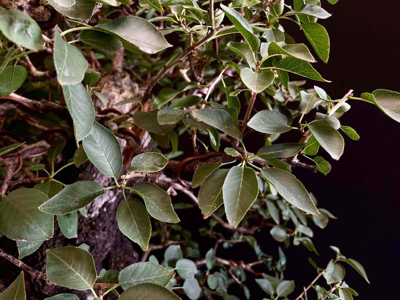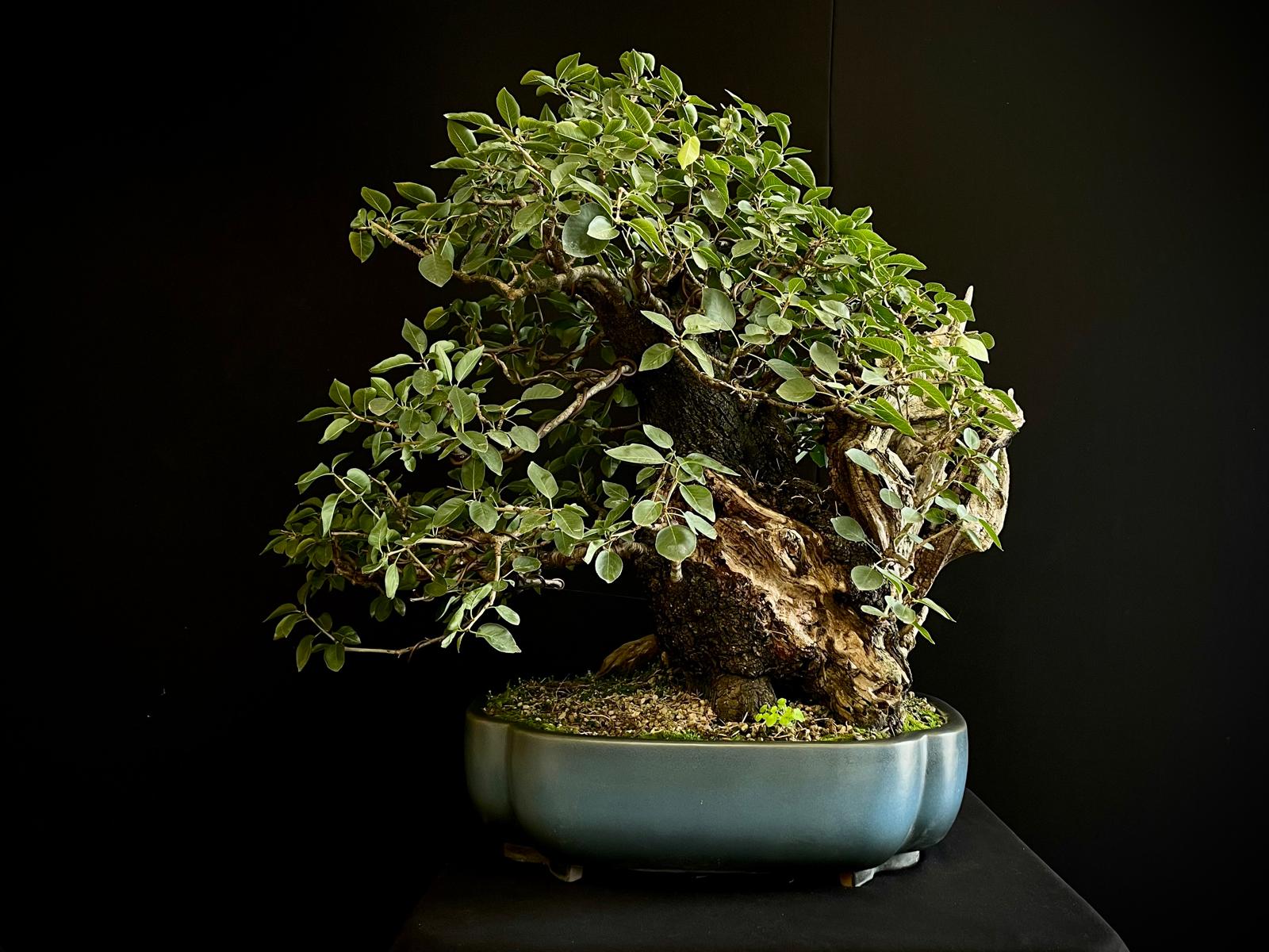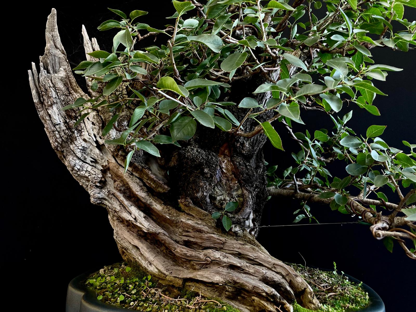 Prunus mahaleb (Cerezo de Santa Lucía) es un ejemplar impactante desde el primer momento. Muestra un tronco muy grueso y robusto que transmite esa sensación de solidez y fortaleza, lo que se suma a su apariencia majestuosa y poderosa. Su madera muerta es otra característica muy destacada, con una textura craquelada y una forma única que le confiere un gran valor estético a este bonsái.