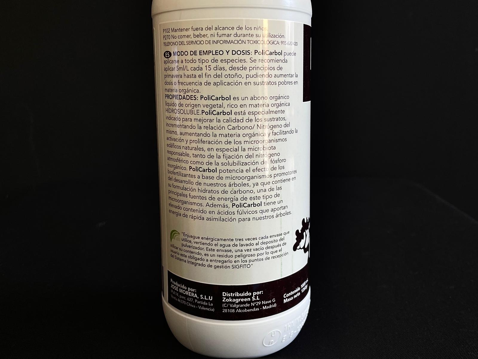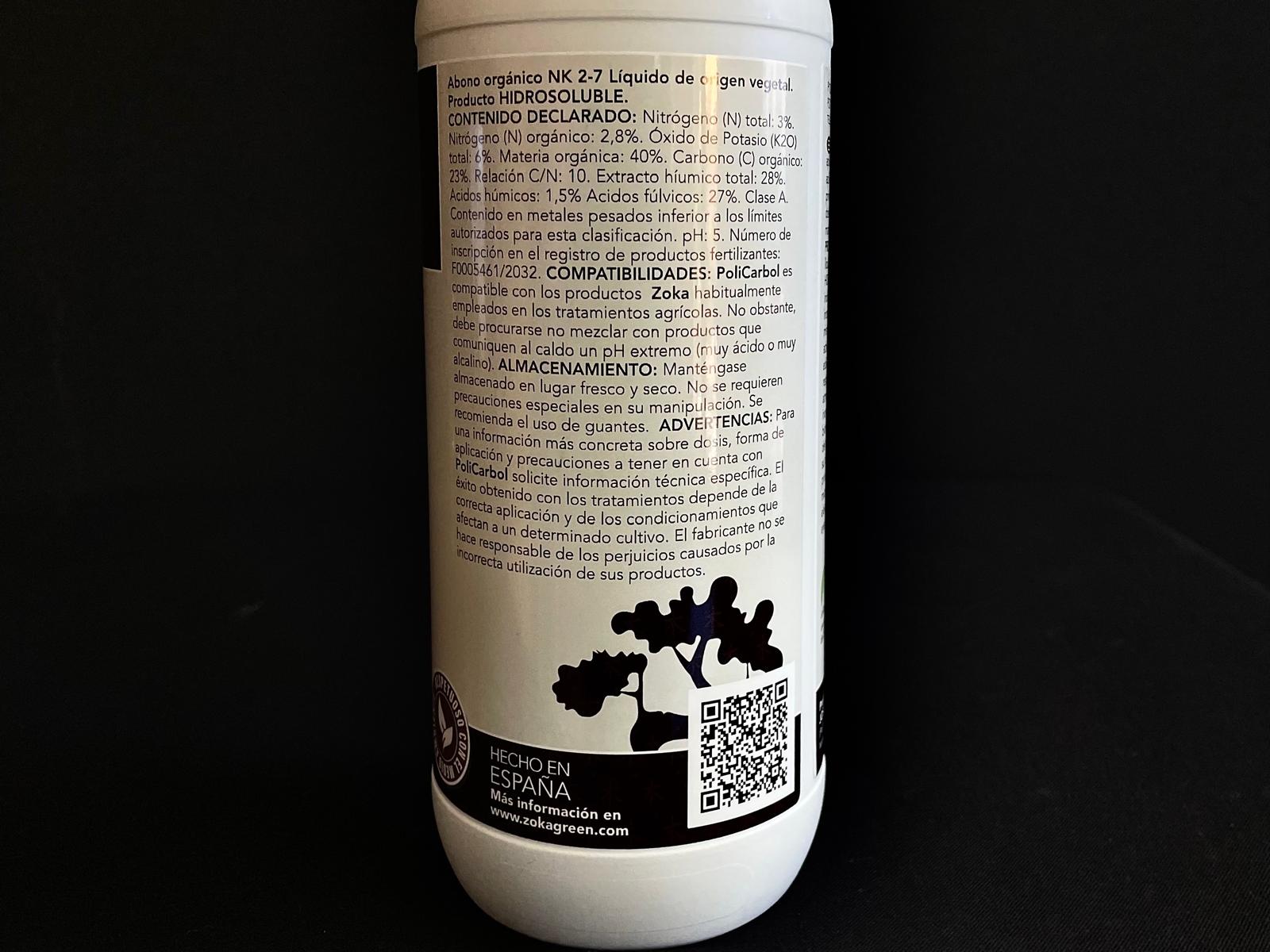 PoliCarbol es un abono orgánico líquido de origen vegetal, rico en materia orgánica hidrosoluble. Está especialmente indicado para mejorar la calidad de los sustratos, incrementando la relación carbono/nitrógeno, aumentando el contenido de materia orgánica y favoreciendo la activación y proliferación de los microorganismos edáficos naturales, especialmente aquellos responsables de la fijación del nitrógeno atmosférico y de la solubilización del fósforo inorgánico.